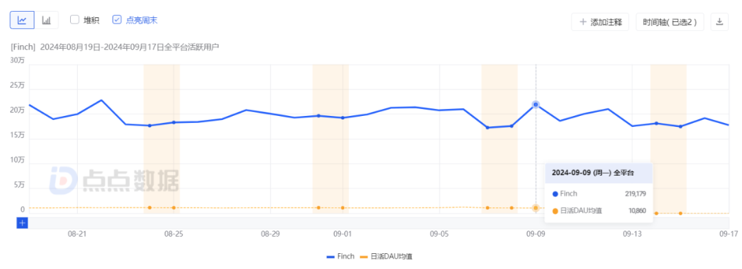 另一个非常值得关注的要点是日活用户,Finch的日活用户数据表现非常出色,最近一个月来看,其日活用户保持在17万到22万之间,远高于健康健美类产品日活用户的均值。