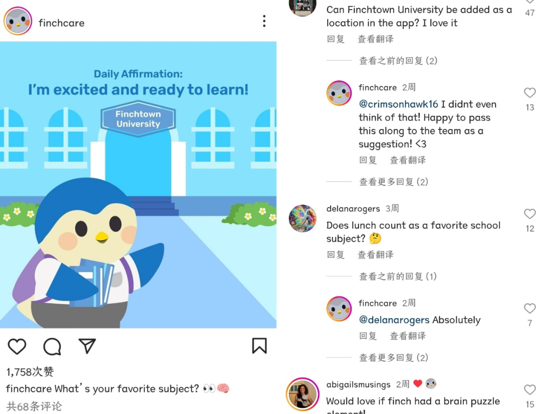 翻看Finch的ins发帖,各种有趣有活动的话题不断,几乎每一个话题下面都能勾起用户的兴趣,与此同时,用户也会反向对Finch的产品提出反馈,比如“能不能在产品中加入位置信息”等等。