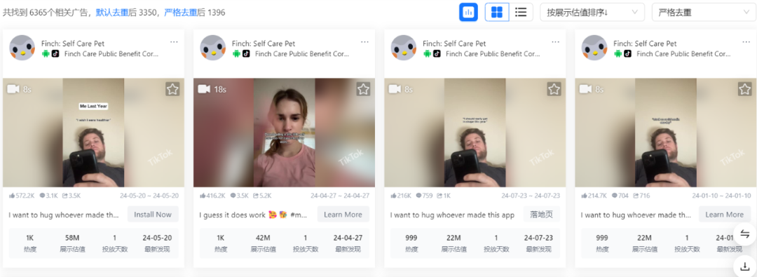 广大大数据显示,最近一年Finch的投放并不算多,严格去重之后,其只有1396条广告投放,最高展现估值达到5800万。