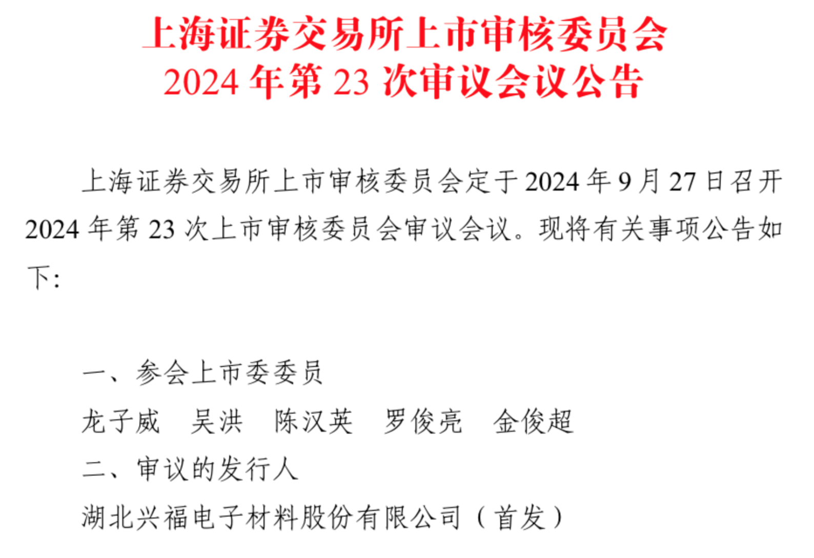 沉寂数周,沪深京有了新动态,国庆节前最后一周,上交所上市委将安排召开会议审议IPO公司湖北兴福电子材料股份有限公司(下称兴福电子)。这也是9月份唯一一家IPO上会的公司。
