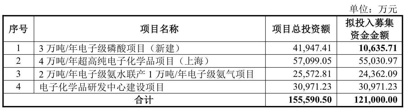 至于兴福电子的12.1亿元的募资,将投入4个项目,其中“3万吨/年电子级磷酸项目”是新建项目,“4万吨/年超高纯电子化学品项目(上海)”、“2万吨/年电子级氨水联产1万吨/年电子级氨气项目”是扩产项目,另还有个电子化学品研发中心建设项目。