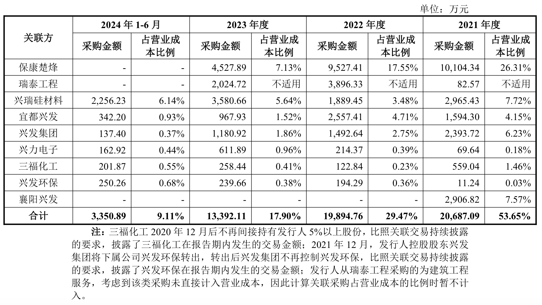 根据说明书,2024年上半年,兴福电子发生的重大经常性关联采购金额3350.89万元,占关联采购的比例97.16%,占营业成本的9.11%,而这个数据在2021年约为2.07亿元,占营业成本的比例高达53.65%。