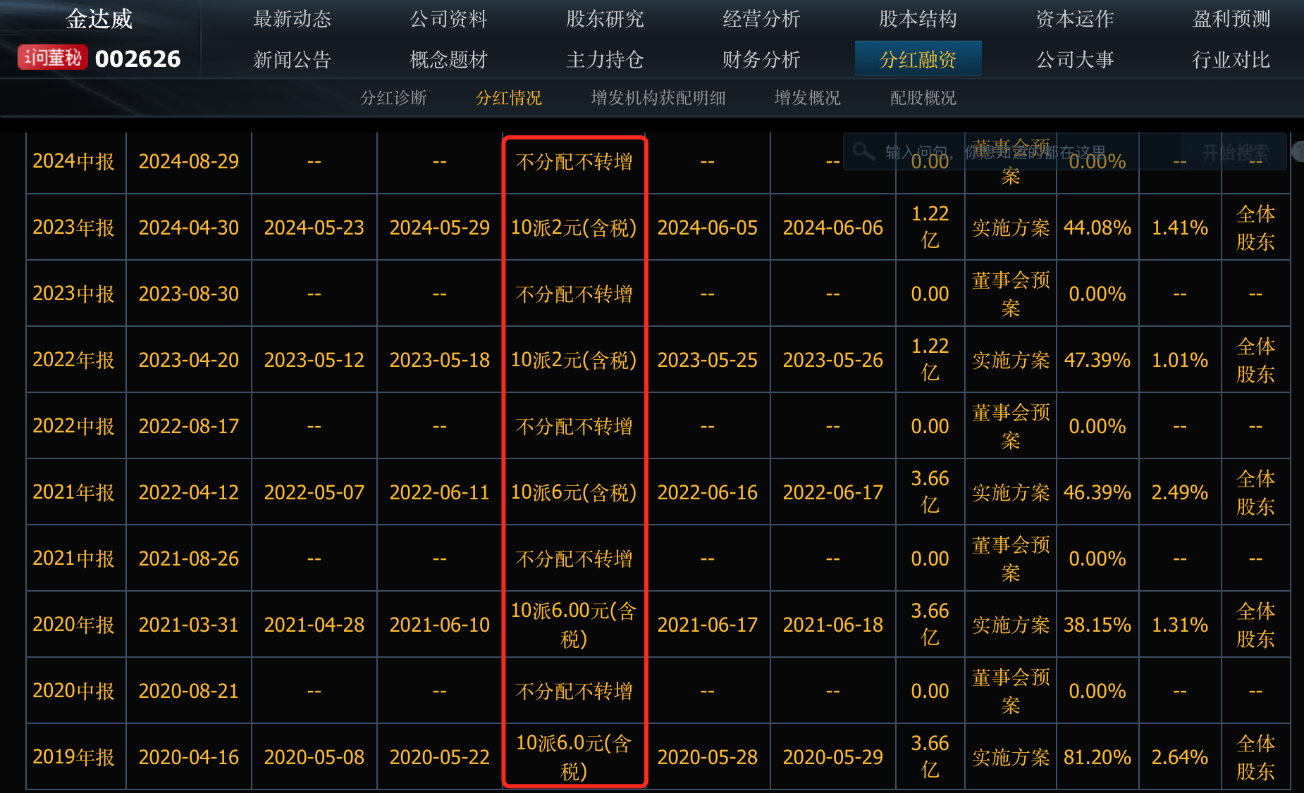 金达威是2011年10月28日上市的,经营保健食品及饲料添加剂等。金达威上市来有分红习惯,每年都伴有分配方案。2023年的方案为10派2元,分红总额1.22亿元。