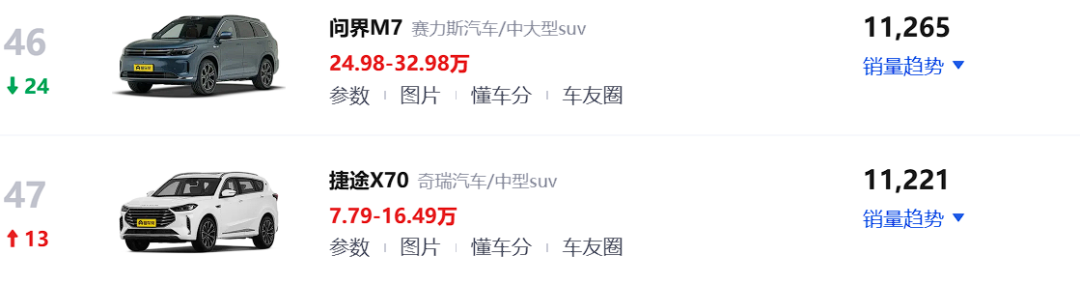 8月销量榜显示,大众朗逸排名上升一位,排名第五,本田crv上升了11位,捷途X70上涨13位,速腾、探岳、奔驰C等多款油车排名上升,涵盖轿车、SUV、越野车等多个品类,反而新能源明星车型如问界M7,狂跌24位。