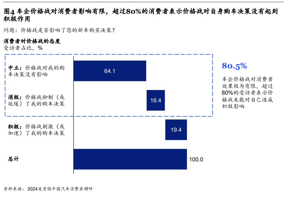 《2024麦肯锡中国汽车消费者调研》显示,汽车消费者在增购换购新车时,绝大多数并没有选择降级消费,而是平级和越级消费。而对于价格战,80.5%的消费者表示价格战对自己选购车辆没有积极影响,并不会因为车辆降价而选择新车。