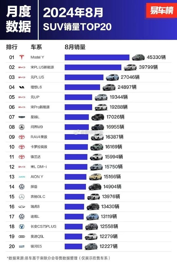 8月SUV销量TOP20榜单揭晓:特斯拉Model Y占据榜首