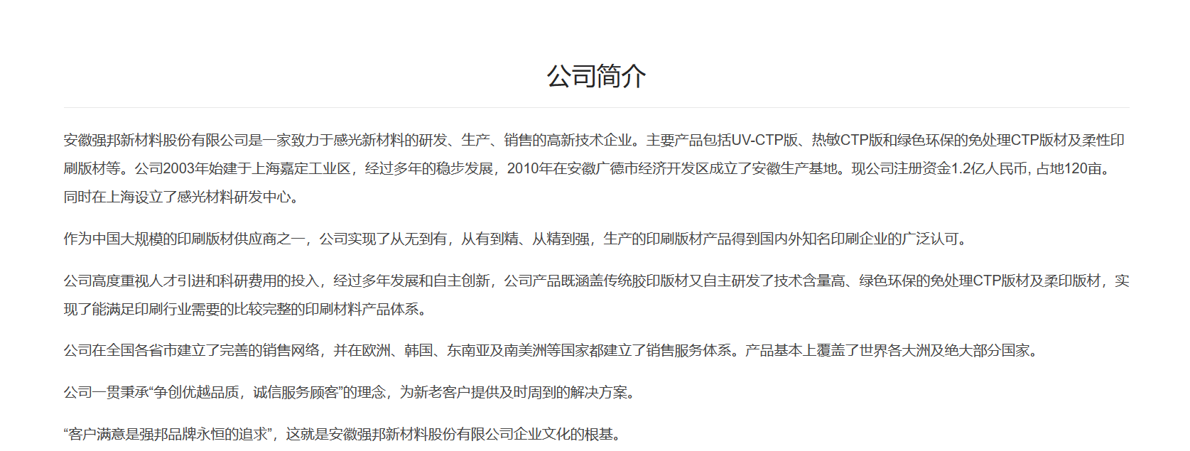 据企业官网和天眼查消息,安徽强邦新材料股份有限公司是一家致力于感光新材料的研发、生产、销售的高新技术企业。主要产品包括UV-CTP版、热敏CTP版和绿色环保的免处理CTP版材及柔性印刷版材等。是国家高新技术企业、国家级专精特新“小巨人”企业。