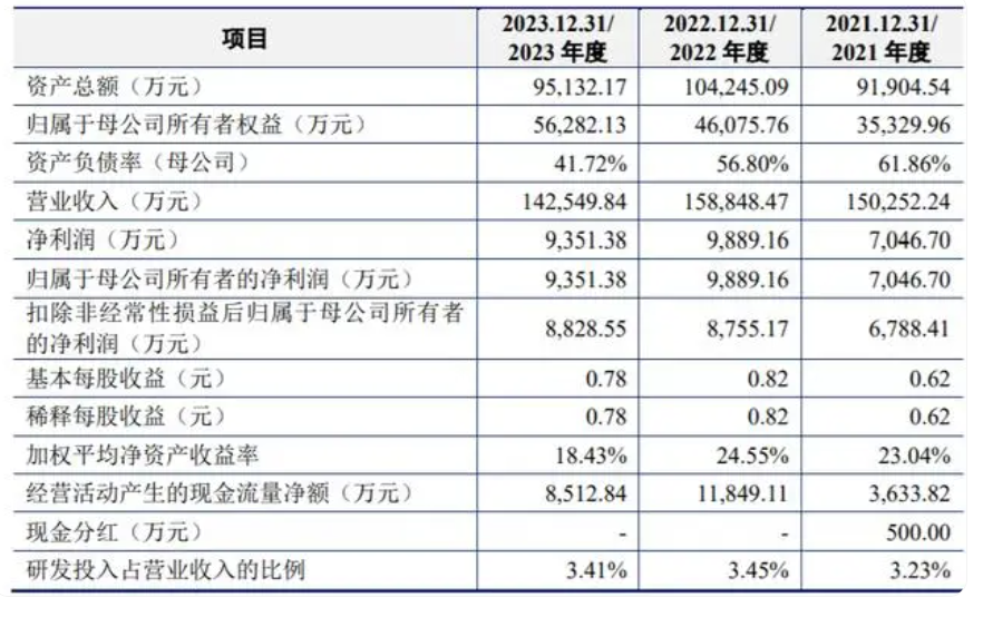 财务数据显示,2021至2023年度,公司实现营业收入分别为15.03亿元、15.88亿元和14.25亿元,净利润分别为7046.7万元、9889.16万元和9351.38万元,最近三年营收保持较大规模,净利润整体呈上升趋势,剔除运费影响后综合毛利率分别为13.32%、14.17%和14.67%。2024年上半年,公司实现营业收入7.35亿元,同比增长8.94%;净利润4612.71万元,同比增长8.34%。