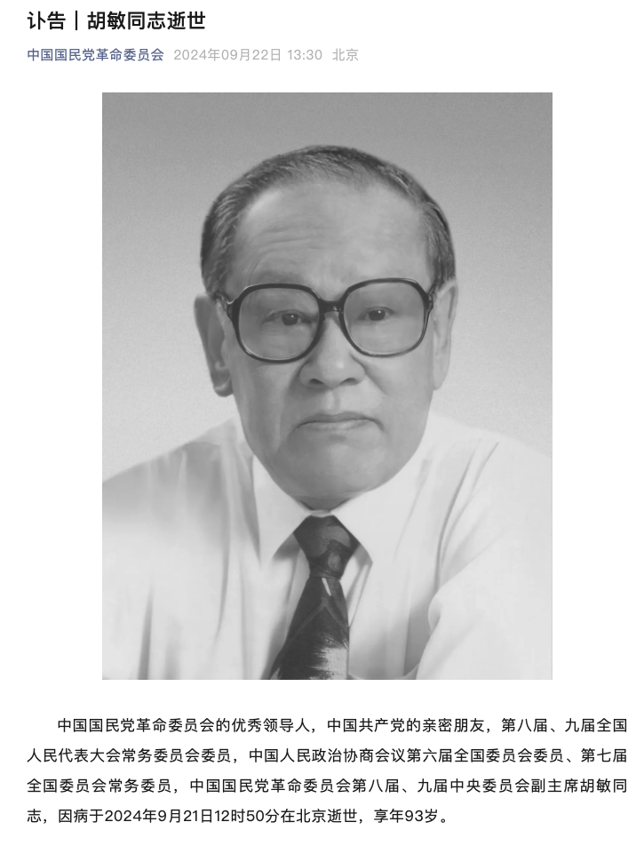 9月22日,中国国民党革命委员会发布讣告:中国国民党革命委员会的优秀领导人,中国共产党的亲密朋友,第八届、九届全国人民代表大会常务委员会委员,中国人民政治协商会议第六届全国委员会委员、第七届全国委员会常务委员,中国国民党革命委员会第八届、九届中央委员会副主席胡敏同志,因病于2024年9月21日12时50分在北京逝世,享年93岁。