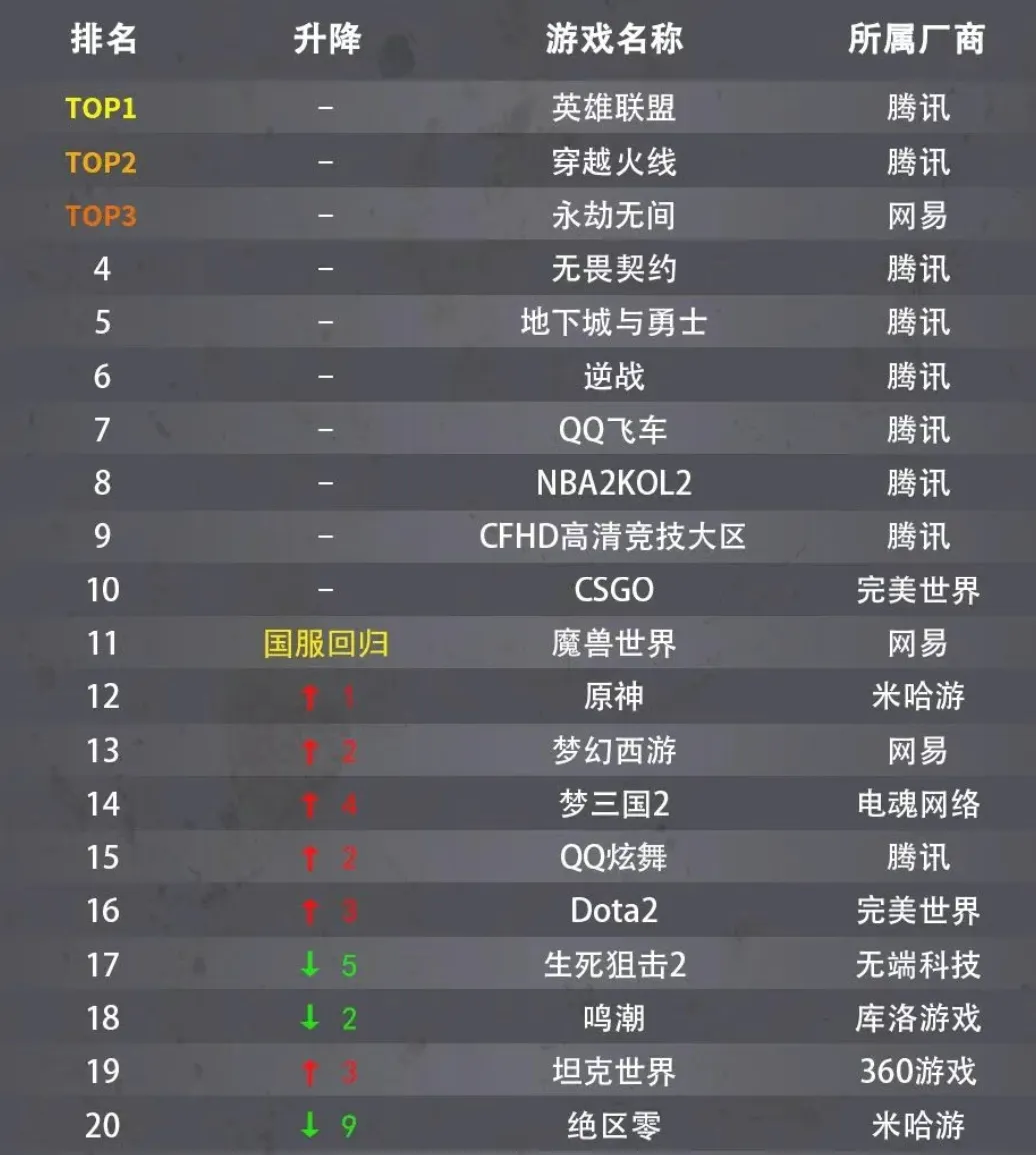 根据8月网吧热游“排行榜”,《英雄联盟》《穿越火线》《永劫无间》《无畏契约》《地下城与勇士》稳居TOP5,《魔兽世界》位列第11名。