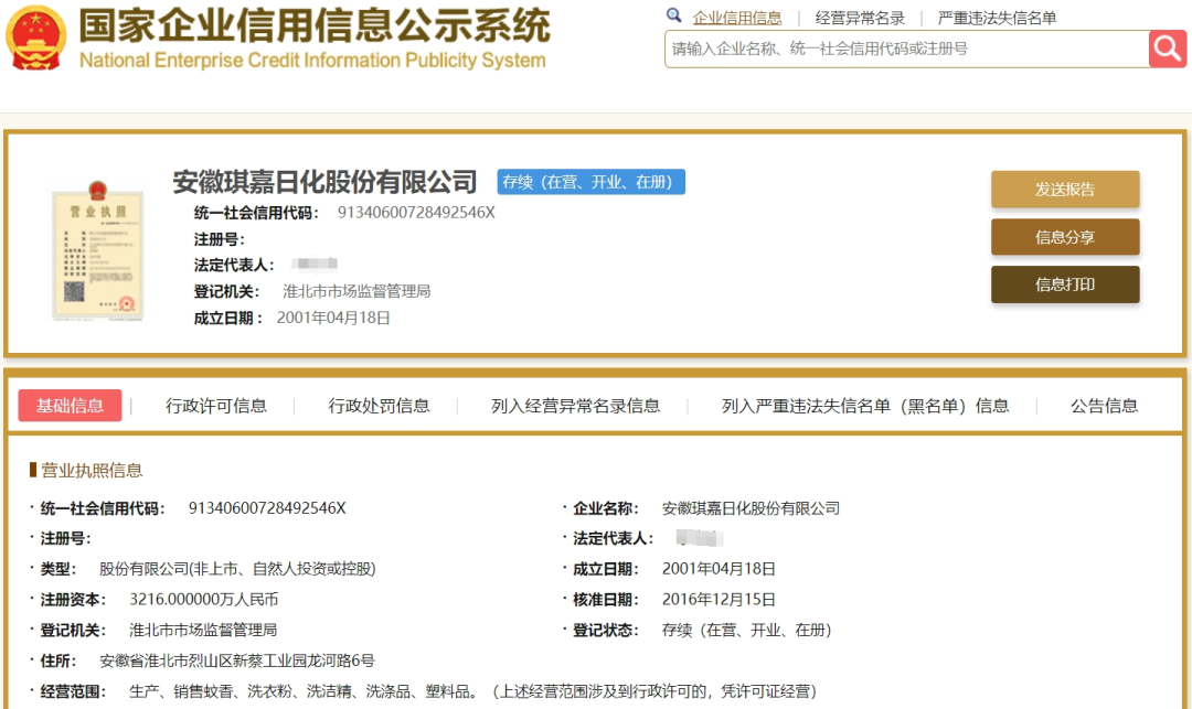 2016年,琪嘉日化在新三板正式挂牌。彼时,据公开资料显示,琪嘉日化拥有年产10万吨洗衣粉和2.5万吨液体洗涤剂的生产设备,是皖北地区较大的家用洗涤品生产企业之一。