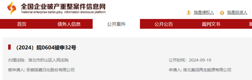近日,青眼从全国企业破产重整案件信息网获悉,安徽琪嘉日化股份有限公司(以下简称“琪嘉日化”)被淮北富润再生能源有限公司(以下简称“淮北富润”)申请破产清算。