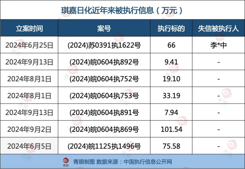 另据中国执行信息公开网显示,仅2024年琪嘉日化就有7项被执行信息,执行金额共计312.76万元,已被列为失信被执行人,其法定代表人李某中也被列入限制消费人员。