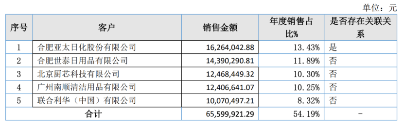 除此之外,琪嘉日化的大客户收入占比较高,2021年前5大客户占总营收比重达54.19%,联合利华是琪嘉日化第五大客户,年销售占比为8.32%。至2022年上半年,前五大客户占总营收比重仍在大幅上升,至72.73%,存在客户集中度较高的风险。