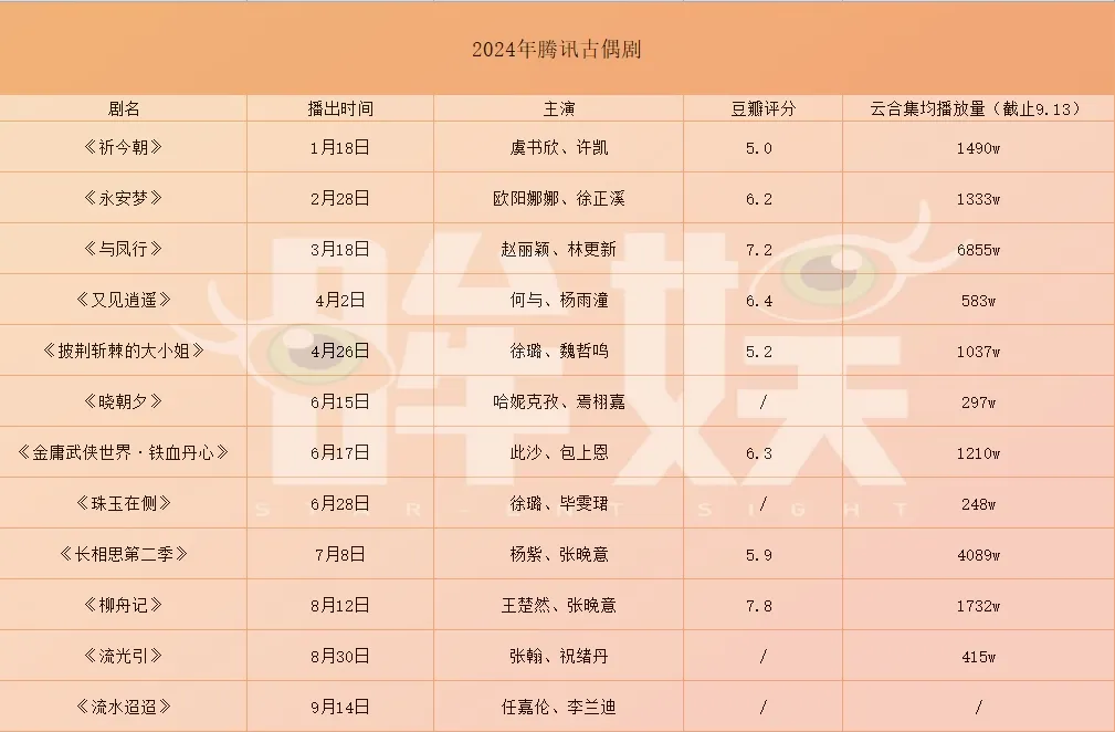 事实上,《流水迢迢》之前,腾讯视频2024年在古偶赛道就已经表现欠佳。