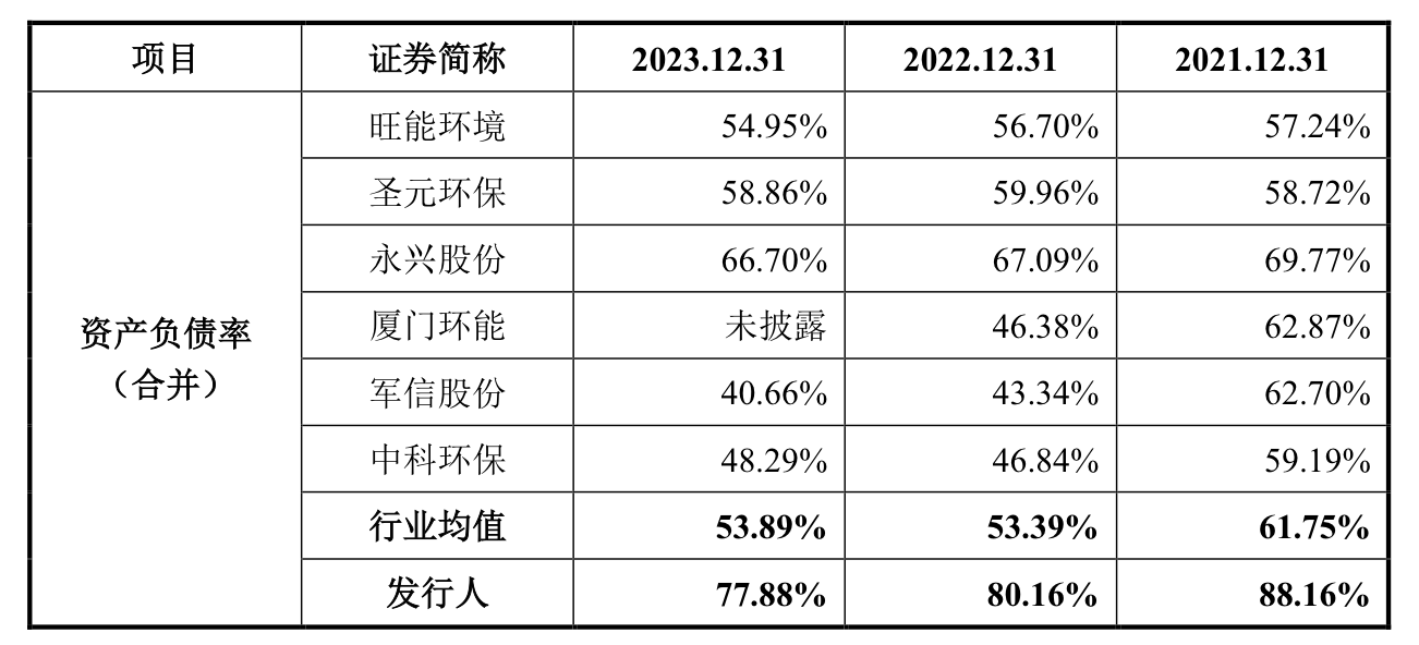 东实环境描述,公司处于业务快速拓展阶段,又是资本密集型行业,资产负债率虽然整体呈现下降趋势,但仍偏高。东实环境2023年合并资产负债率是77.88%,远高于可比公司。