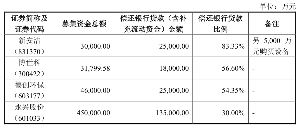 东实环境的“出圈”,还在于其募资将全额用于“偿还银行贷款”,公司计划募资额2.4亿元。