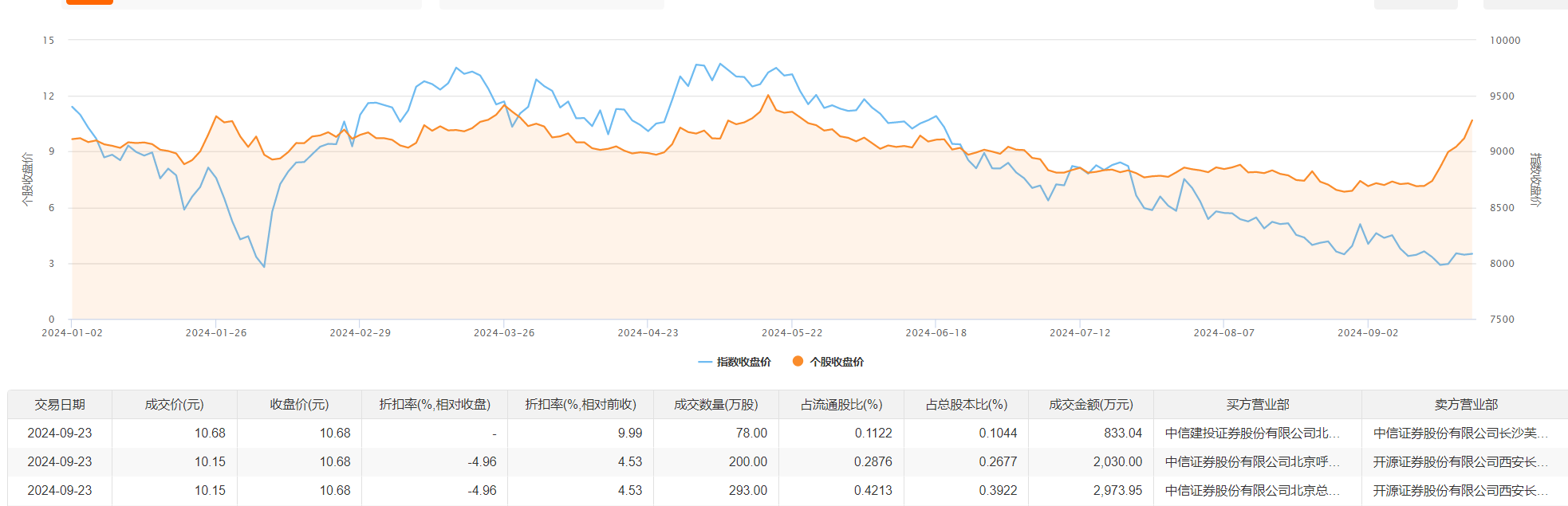 中交地产9月23日大宗交易成交571万股,成交额5836.99万元,占当日总成交额的9.7%,成交均价10.22元,较市场收盘价10.68元折价4.31%,其中最高成交价10.68元,最低成交价10.15元。