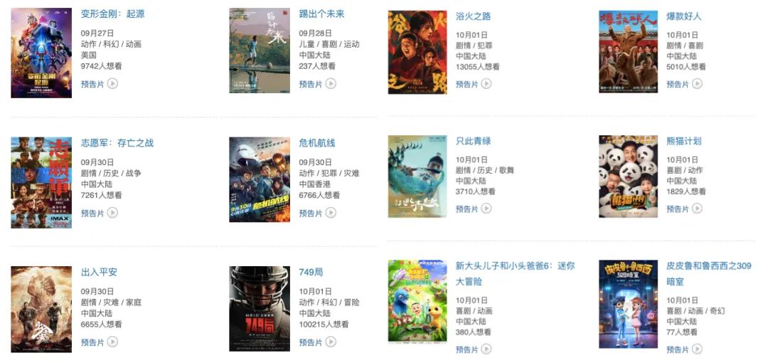 在即将到来的国庆档里,《志愿军:存亡之战》《出入平安》《爆款好人》《749局》《危机航线》《浴火之路》《只此青绿》《熊猫计划》《新大头儿子小头爸爸6:迷你大冒险》等多部影片定档,电影行业的触底反弹会在这里吗?