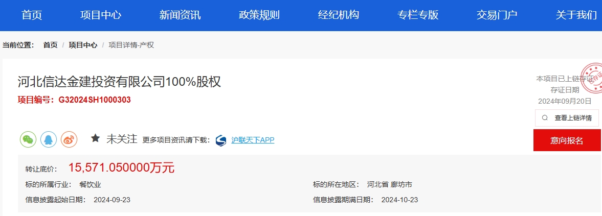 9月23日,上海联合产权交易所披露,河北信达金建投资有限公司(简称“河北信达金建”)100%股权今日起公开挂牌转让。财联社记者注意到,此次挂牌转让底价为15,571.05万元,即约1.56亿元,较今年7月份时的公开挂牌转让底价高出了近1000万元。