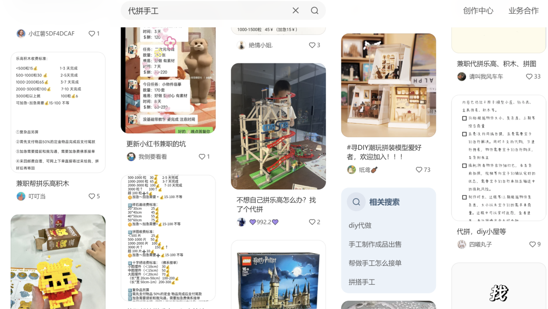 惊蛰研究所在小红书对#手工代拼#进行搜索时,发现手工代拼服务的内容包括乐高、拼图、diy小屋、十字绣和钻石画等,商业模式主要是按件收费,即根据客户提供的套装型号、难度等级和交付时间来确定价格。为了确定合作意向,商家在正式接单前,还会收取一定数量的定金。