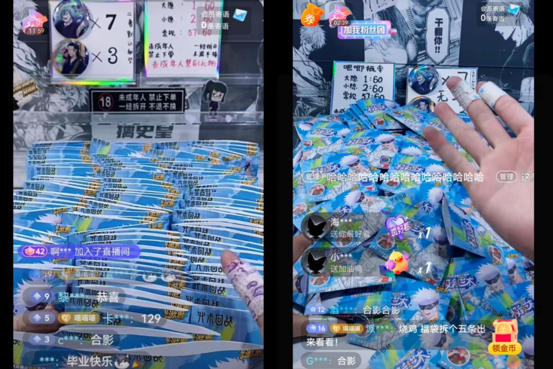 比如,在知名IP《咒术回战》的某角色盲盒代拆直播间里,当主播拆到“真人”和“脑花”(《咒术回战》中的反派角色),会额外赠送消费者3个和7个新盲盒,在此机制下,有一部分消费者下单三包可以带走一两百个角色周边。在这种玩法加持下,代拆盲盒直播间变得人来人往,有的消费者甚至在直播间花费上千元成箱成箱地购买。