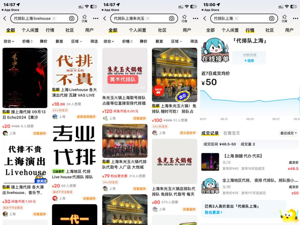 惊蛰研究所在闲鱼上搜索音乐演出和餐厅代排时发现,代排队服务的成交价格一般在十几元到上百元之间浮动。而据平台数据显示,“代排队上海”的近期成交价在50元左右。