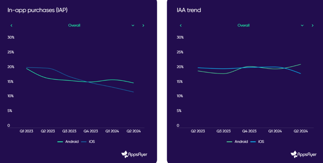 整体来看,2024年Q2的IAA相比2023年Q2增长了4%。安卓平台的IAA增长了12%,而iOS平台则下降了10%。从年同比来看,整体增长了3%,其中Android增长7%,而iOS下降4%。