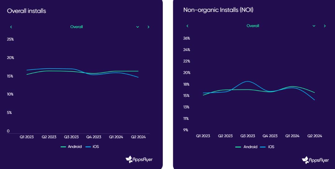 2024年上半年的用户增长情况喜忧参半。安卓平台总体安装量和NOI同比增长了3%,而iOS则出现了下降,整体下降了9%,NOI下降了2%。
