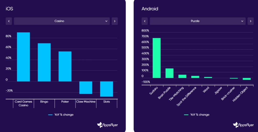 iOS特定类别(如体育和益智游戏)的广告支出也大幅增加。相比之下,超休闲和中核游戏的广告支出有所减少,尤其是在iOS平台上,超休闲游戏的广告支出同比下降了34%,中核游戏类别如RPG则大幅下降了35%。