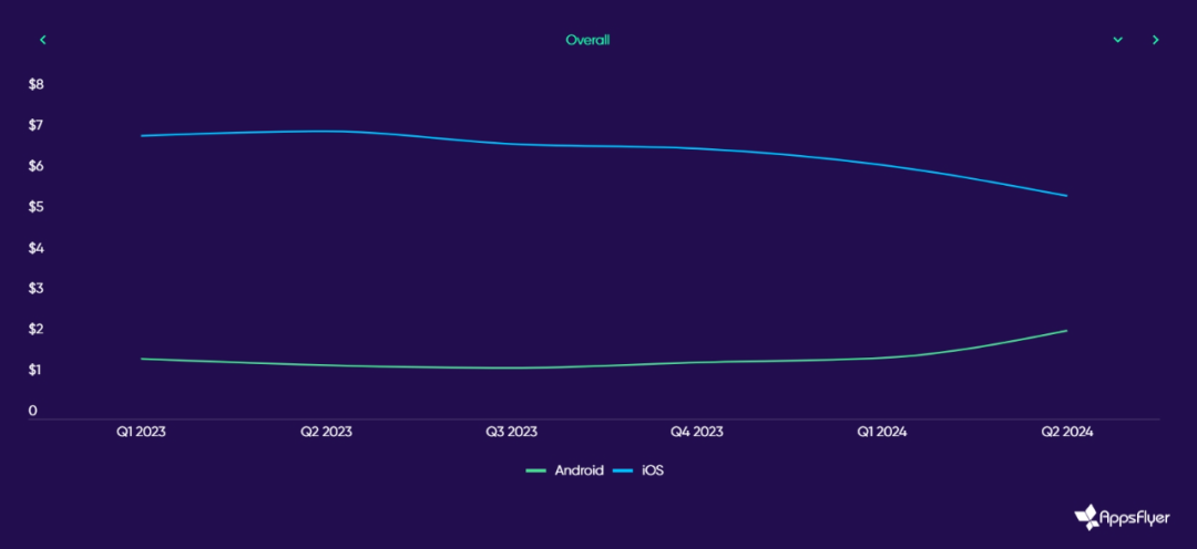 2023年的一个重要趋势是全球安卓和iOS平台之间的媒体投放成本发生了变化。iOS的媒体成本下降,而安卓的成本则有所上涨。这一趋势在超休闲、模拟、消除和益智类游戏等类别中尤为明显。