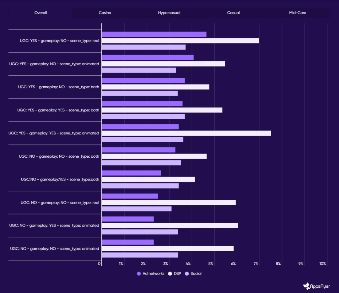 那么,哪种类型的广告创意表现最佳呢?事实证明,UGC是提高留存率的秘密武器,适用于各种广告网络、需求方平台和社交渠道。这一点在中核、休闲和超休闲游戏类别中尤为显著,博彩游戏是个例外。UGC素材的魅力在于它建立的信任感。当用户看到由真人创作的内容时,他们更可能去安装和参与应用。