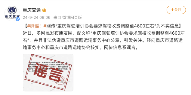 @重庆交通 消息,近日,多网民发布朋友圈,配文称“重庆驾驶培训协会要求驾校收费调整至4600左右”,并且非法伪造重庆市道路运输事务中心公章,引发关注。经向重庆市道路运输事务中心和重庆市道路运输协会核实,网传信息系谣言。