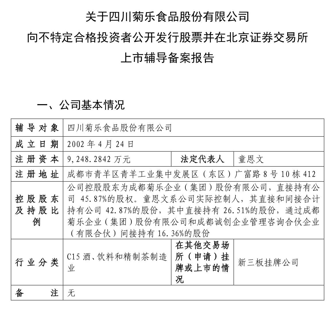 菊乐股份成立于2002年4月24日,注册资本9248.2842万元,控股股东为成都菊乐企业(集团)股份有限公司,直接持有公司45.87%的股权。童恩文系公司实际控制人,其直接和间接合计持有公司42.87%的股份,其中直接持有26.51%的股份,通过成都菊乐企业(集团)股份有限公司和成都诚创企业管理咨询合伙企业(有限合伙)间接持有16.36%的股份。