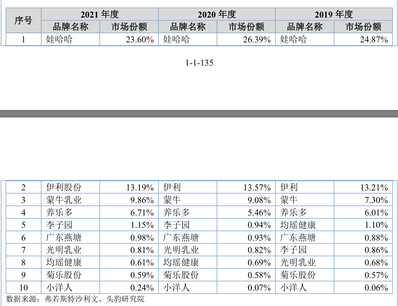 资料显示,菊乐股份主营业务为含乳饮料及乳制品的研发、生产和销售,主要产品包括含乳饮料、发酵乳、巴氏杀菌乳及灭菌乳等,旗下“酸乐奶”、“嚼酸奶”、“大牛奶”等产品于市场占用一席之地。根据弗若斯特沙利文以及头豹研究院数据,2021年度,菊乐股份在中国含乳饮料市场份额为0.59%,排名第九。