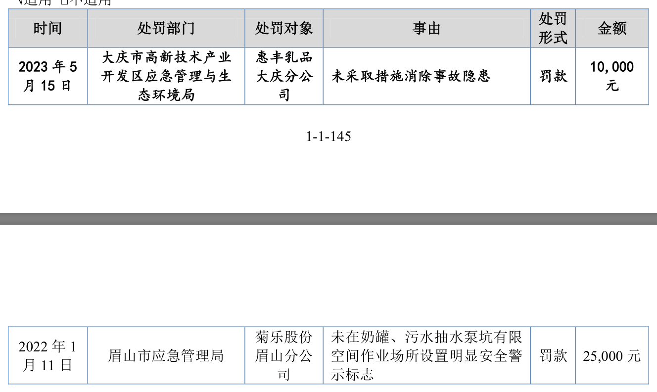 从最新在全国中小企业股转系统披露的公开转让说明书中看到,2022年1月11日,菊乐股份眉山分公司被眉山市应急管理局罚款,事由是未在奶罐、污水抽水泵坑有限空间作业场所设置明显安全警示标志,罚款金额2.5万元。