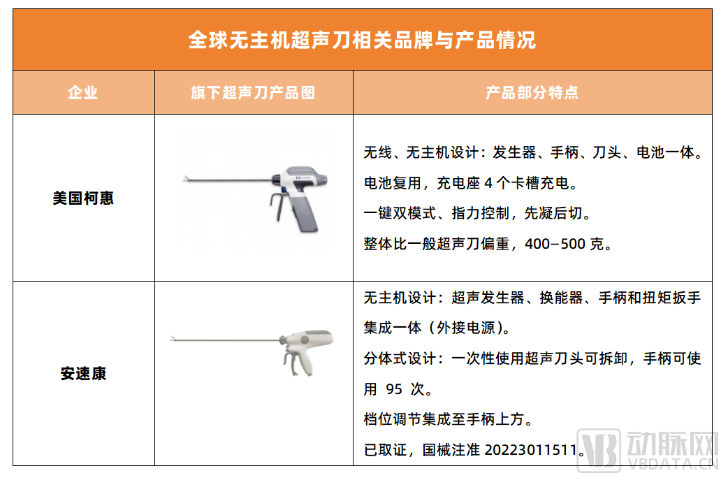 另一类是无主机超声刀,代表企业有美国柯惠、安速康等。详细来说,无主机超声刀的设计摒弃了对独立主机的需求,将所有功能都集成到超声刀的手柄中。该设计可以降低医院采购成本,以及简化应用场景中的操作流程。
