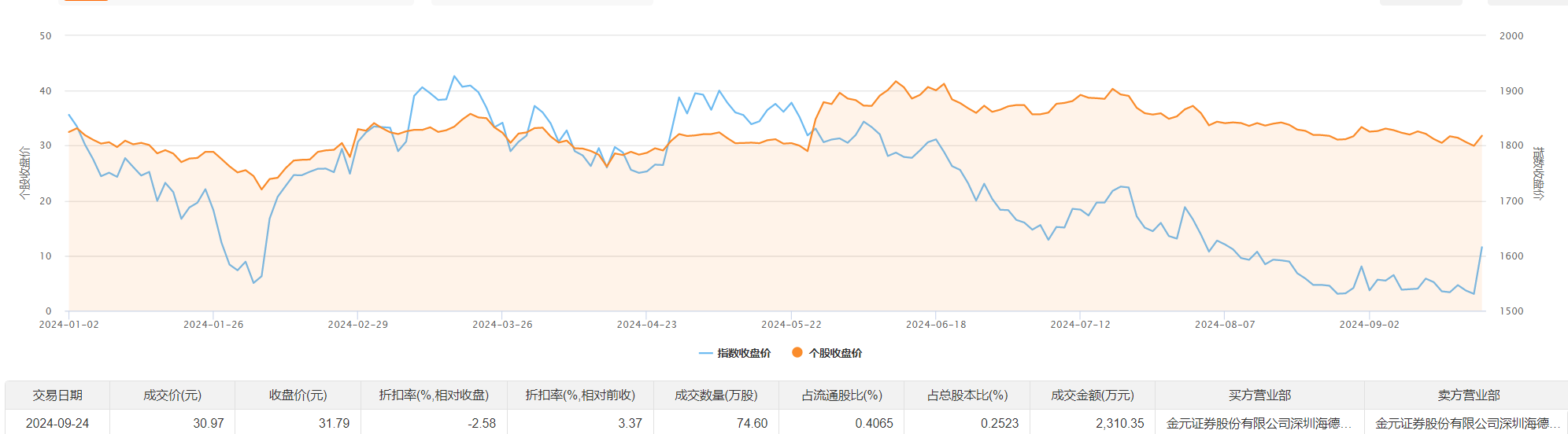 容大感光9月24日大宗交易成交74.6万股,成交额2310.35万元,占当日总成交额的4.51%,成交价30.97元,较市场收盘价31.79元折价2.58%。