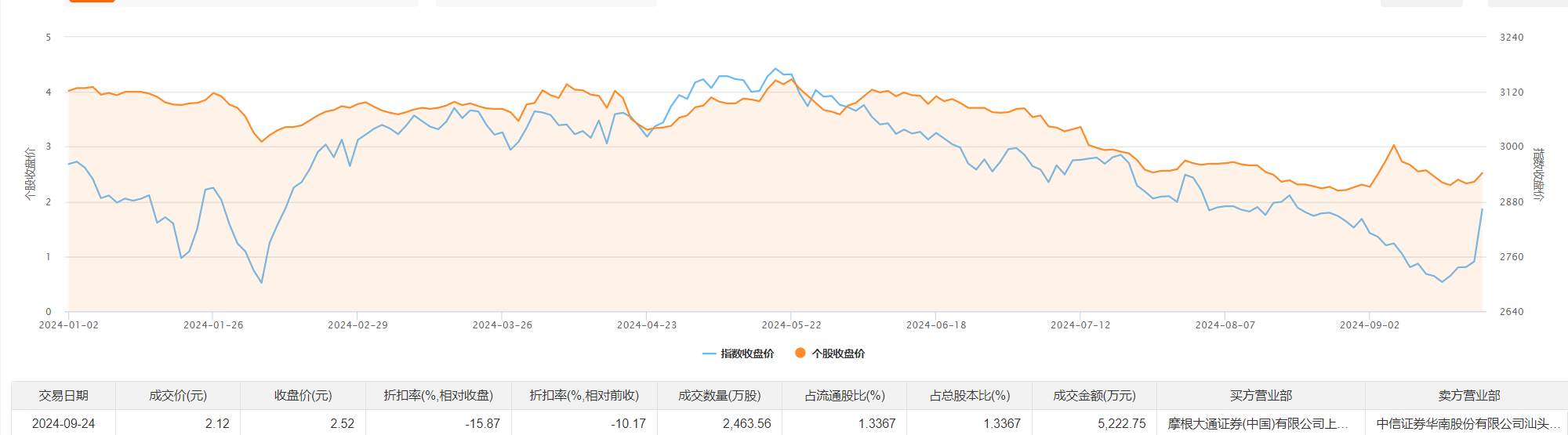 东峰集团9月24日大宗交易成交2463.56万股,成交额5222.75万元,占当日总成交额的28.01%,成交价2.12元,较市场收盘价2.52元折价15.87%。