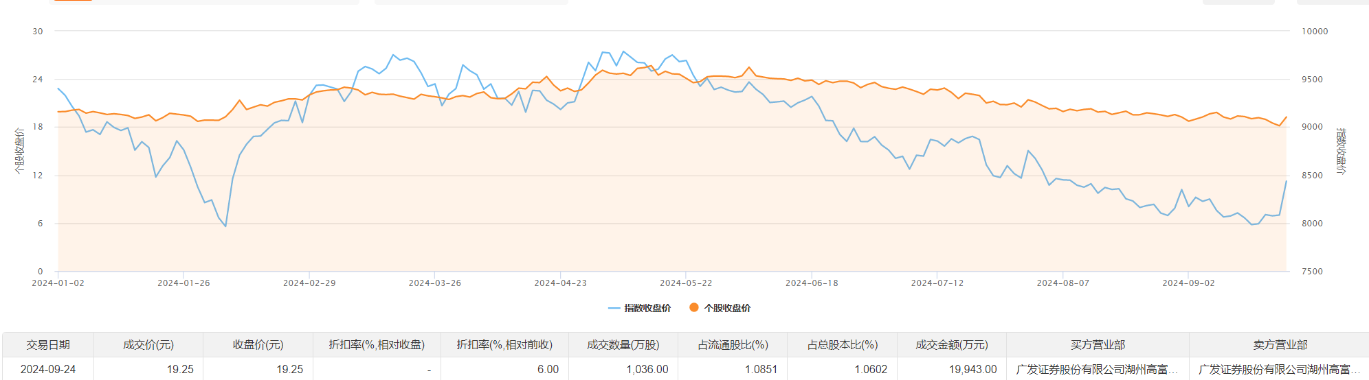 久立特材9月24日大宗交易成交1036万股,成交额1.99亿元,占当日总成交额的46.86%,成交价19.25元,较市场收盘价19.25元持平。