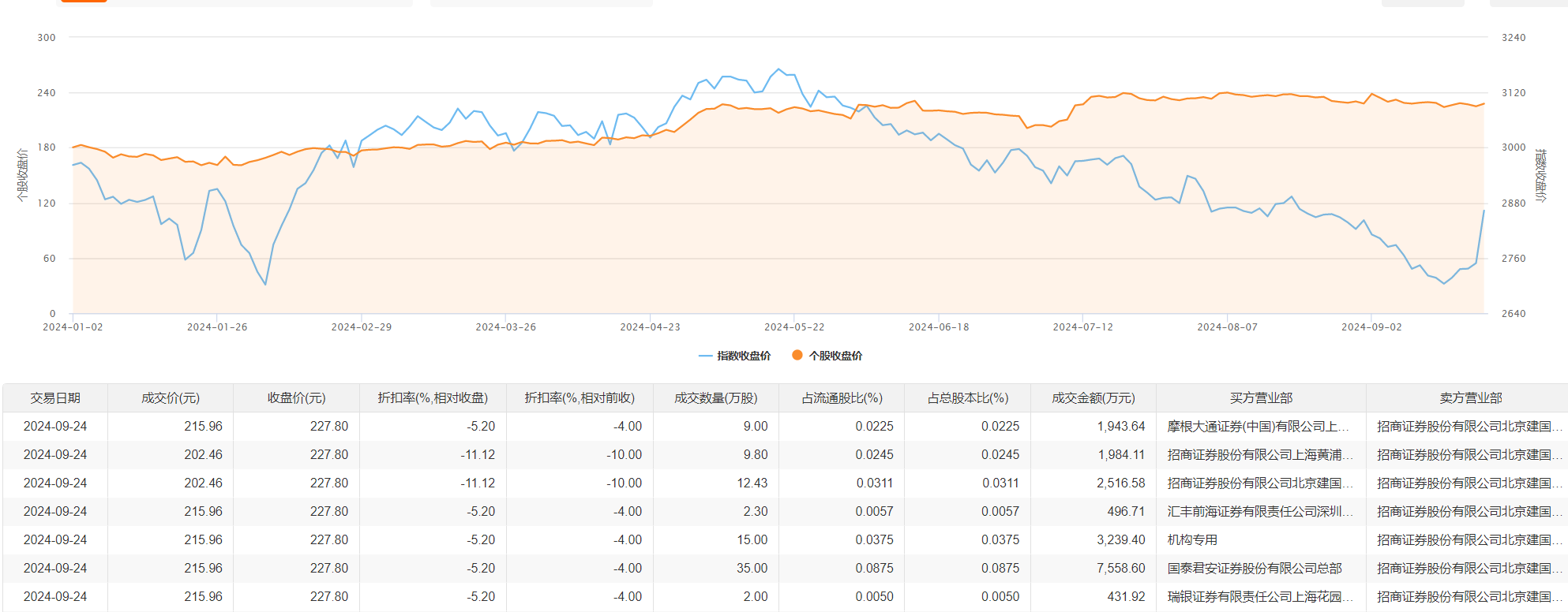 东鹏饮料9月24日大宗交易成交85.53万股,成交额1.82亿元,占当日总成交额的41.3%,成交均价212.45元,较市场收盘价227.8元折价6.74%,其中最高成交价215.96元,最低成交价202.46元。
