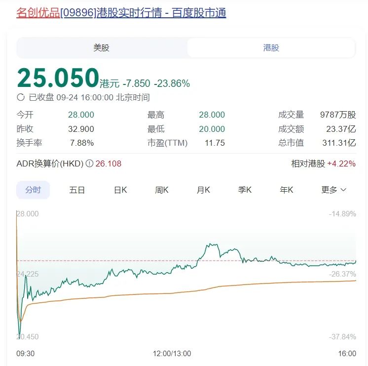 美股方面,截至9月23日收盘,名创优品下跌16.65%,报收13.72美元/股,创下今年2月以来新低。港股方面,9月24日开盘后,名创优品一度跌至20港元/股,跌幅近40%。按照百度股市通提供的市值计算,为了这场入股,名创优品预先“掏”了149亿元左右的市值。