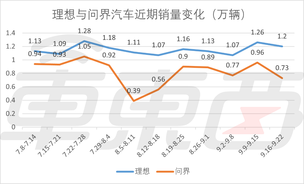 而理想汽车的老对手问界汽车本周继续保持周销量榜第二,第38周的销量为0.73万辆。