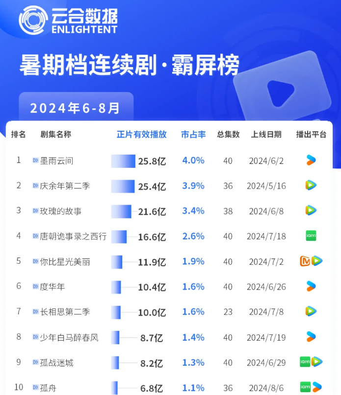 所谓“古偶滑落”,是指过去是播放量保障的古偶剧,正在急速下滑。云合数据的暑期档连续剧·霸屏榜中,除了第一名《墨雨云间》斩获25.8亿播放量以外,《度年华》和《长相思第二季》都在10亿左右打转,去年榜首《长相思第一季》则为26.5亿,高于今年的状元《墨雨云间》。