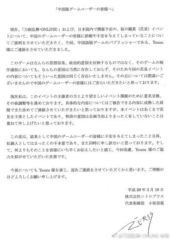 《刀剑乱舞》事件在中国社交网络被玩家主动传播之后,代理方游族迅速联系了日本出品方N+公司,并于3月10号凌晨上传了N+社长的书面回复,对本次活动的争议之处表达歉意,并表示将会迅速处理。
