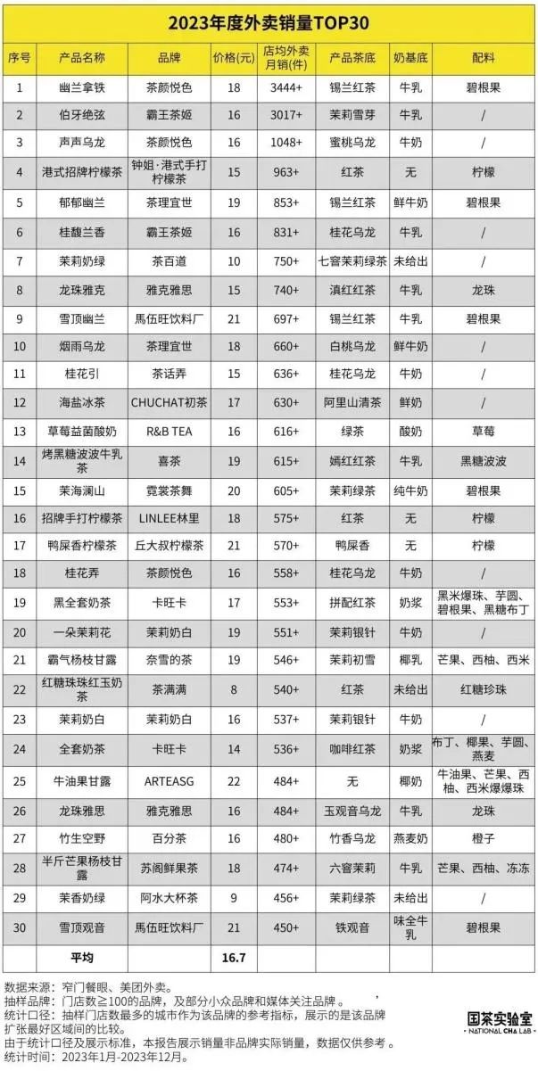 据窄门餐眼与美团外卖的数据显示,2023年全年店均外卖月销第一的产品是茶颜悦色的“幽兰拿铁”,第二是霸王茶姬的“伯牙绝弦”,第三是茶颜悦色的“声声乌龙”。而这张TOP30的表格中,仅有一款奈雪的“茶”。