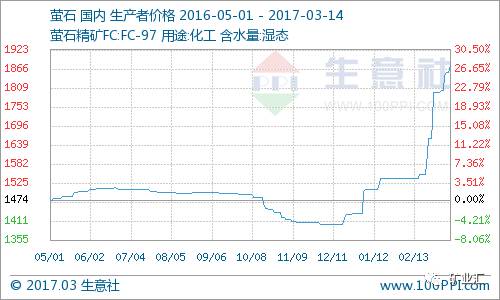 国内萤石市场大幅攀升,据生意社数据显示,本周周初97%萤石湿粉均价在1801.25元/吨,周末涨至1857.5元/吨,涨幅3.12%,同比上涨25.51%。