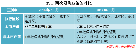 与2016年10月份的限贷限购政策相比,本次南京市出台的调控政策主要是在限购方面进行了升级。详细对比见下表1: