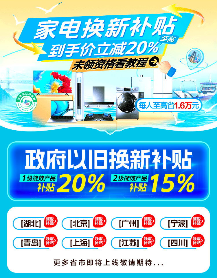 双11期间,苏宁易购全面承接国家以旧换新政策,加力打造线上线下全场景换新渠道。目前,北京、湖北、广东、宁波、上海、江苏、青岛、四川等地线上以旧换新专场已登陆苏宁易购APP,天津、安徽等地线上换新专区近日将密集上新。相关负责人表示,苏宁作为政府指定补贴发放平台,在政府对绿色节能产品15%-20%的优惠基础上,联合品牌商家、金融机构,为用户提供产品更多、优惠更大、服务更好的换新体验。面向苏宁易购Super会员等核心用户,苏宁易购还将发放满1500减120、满3000减40、满5000减400、满8000减600等“会员大额券”,可叠加国家以旧换新补贴、满300减50等优惠。