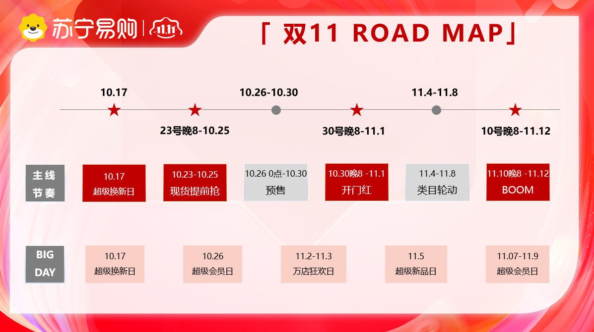 今年苏宁易购双11全周期将分为四个阶段。10月17日,苏宁易购双11将全面启动,并在10月23日至25日以现货方式开启提前抢购。紧接着10月30日晚8点进入开门红阶段,随后开启类目轮动,在11月10日晚8点迎来爆发期。活动期间,苏宁易购加大对于“百亿补贴”专场支持力度,通过官方补贴平台全额承担、降佣减费等举措,帮助消费者省心买、商家放心卖。产品方面,苏宁易购将聚焦主站内外全域资源打造100个爆款单品,多款品类单品达到“全年底价”。
